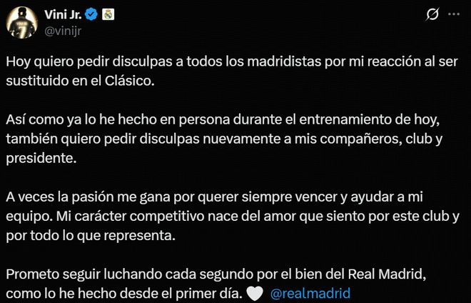 北京时间10月29日,皇马球员维尼修斯就不满被球队换下在个人社媒致歉。